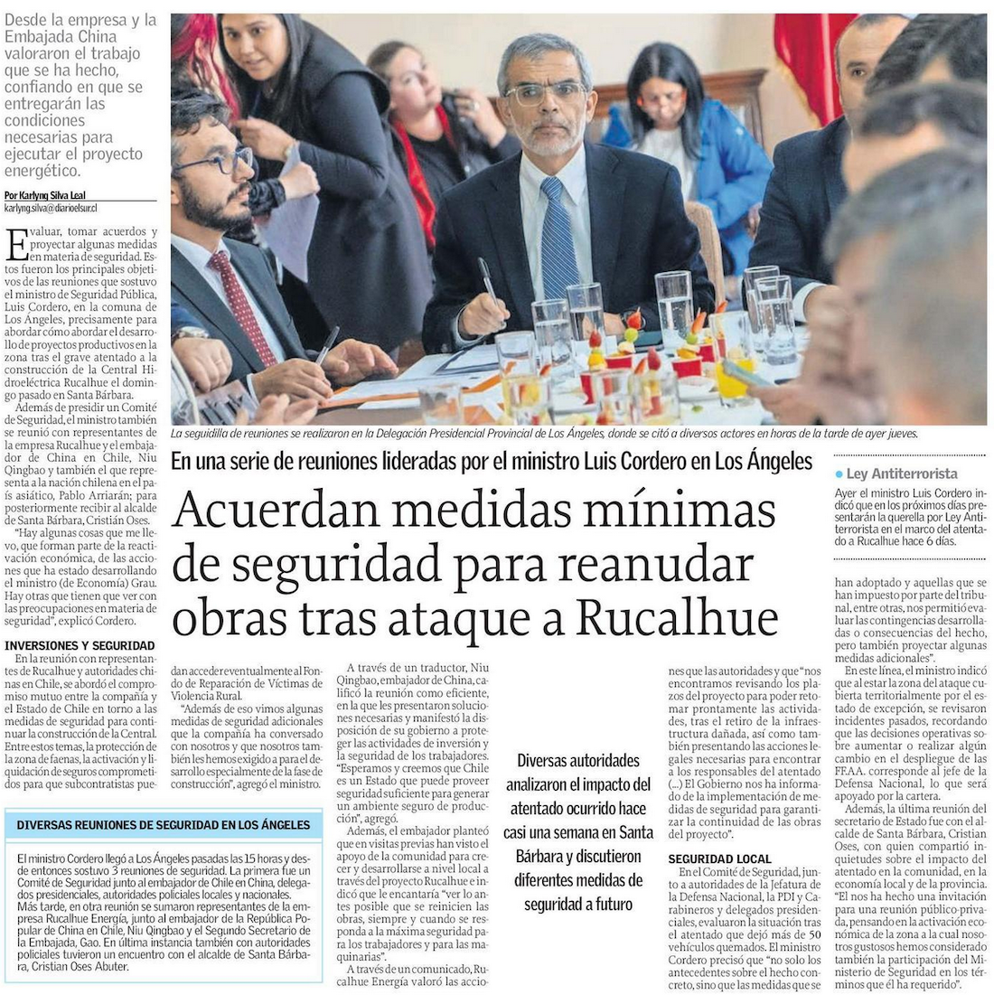 Cordero promete más seguridad para central Rucalhue y manifiesta preocupación ante inversionistas chinos - (Diario Financiero)