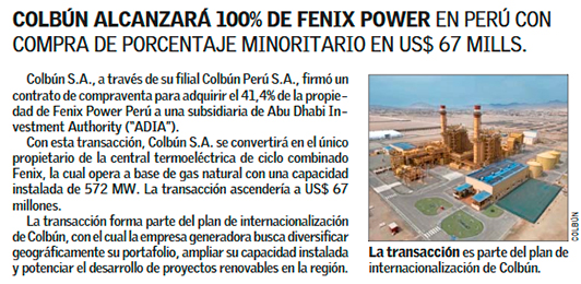 Colbún compra participación de fondo de Abu Dhabi y queda como única dueña de termoeléctrica en Perú - (Diario Financiero)