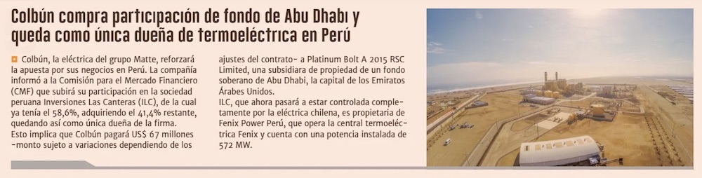 Colbún alcanzará 100% de Fenix Power en Perú con compra de porcentaje minoritario en US$ 67 mills. - (El Mercurio de Santiago)
