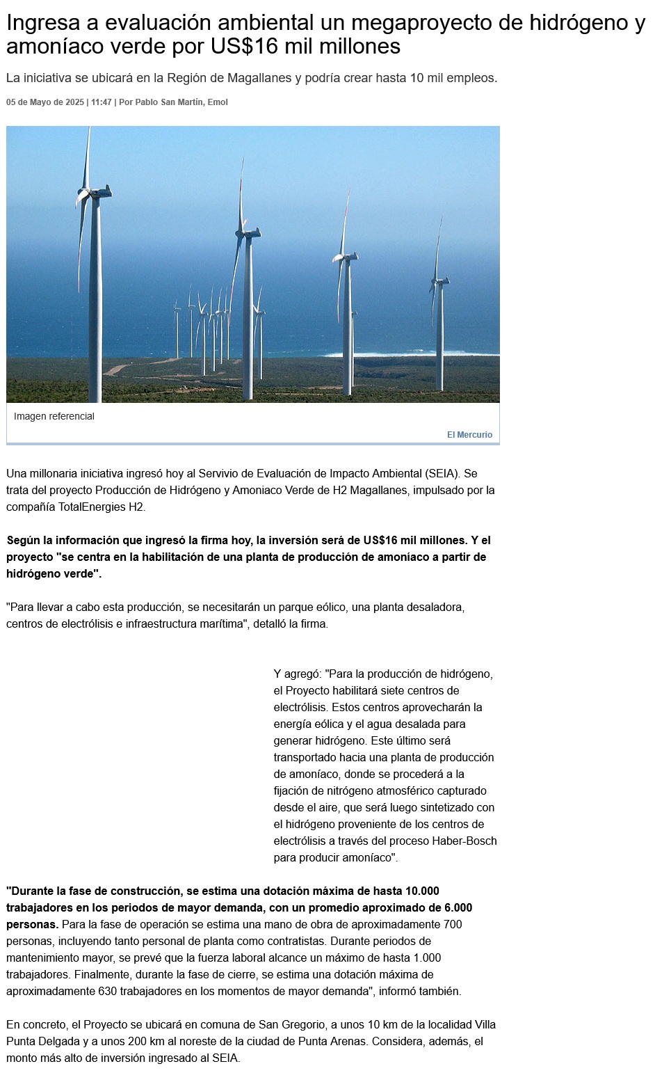 TotalEnergies H2 ingresa proyecto de hidrógeno y amoníaco por US$ 16.000 millones a tramitación ambiental - (La Tercera Online)