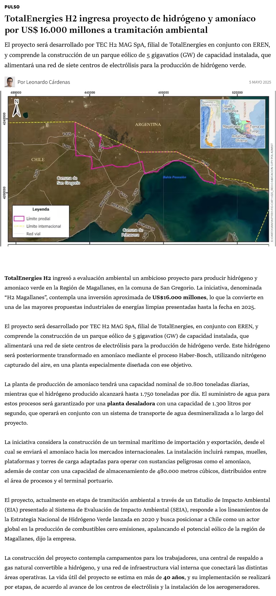 Proyecto H2 Magallanes por US$16 mil millones ingresa a evaluación ambiental y marca un hito en la transición energética de Chile - (revistaei.cl)