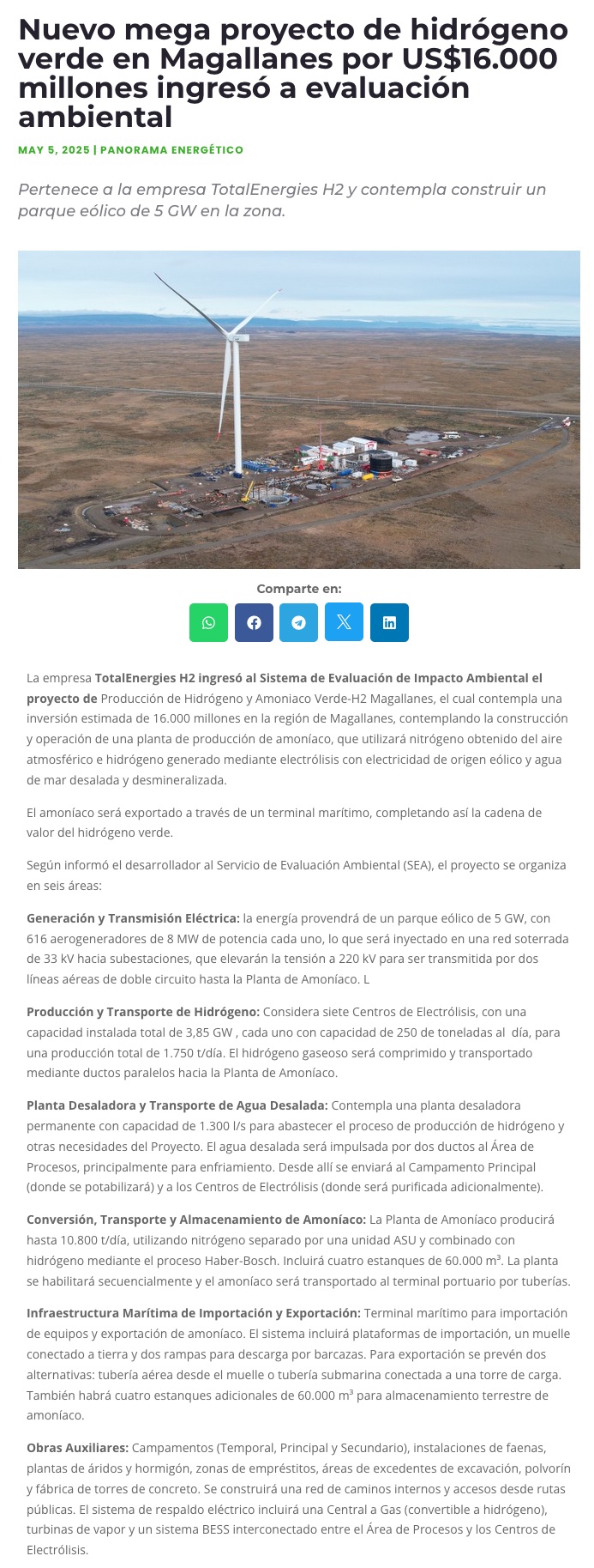 TotalEnergies H2 ingresa proyecto de hidrógeno y amoníaco por US$ 16.000 millones a tramitación ambiental - (La Tercera Online)