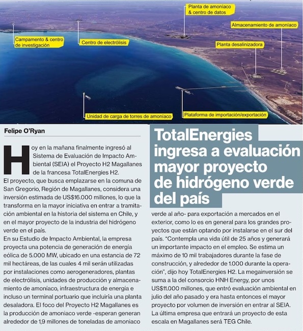 TotalEnergies H2 ingresa proyecto de hidrógeno y amoníaco por US$ 16.000 millones a tramitación ambiental - (La Tercera Online)