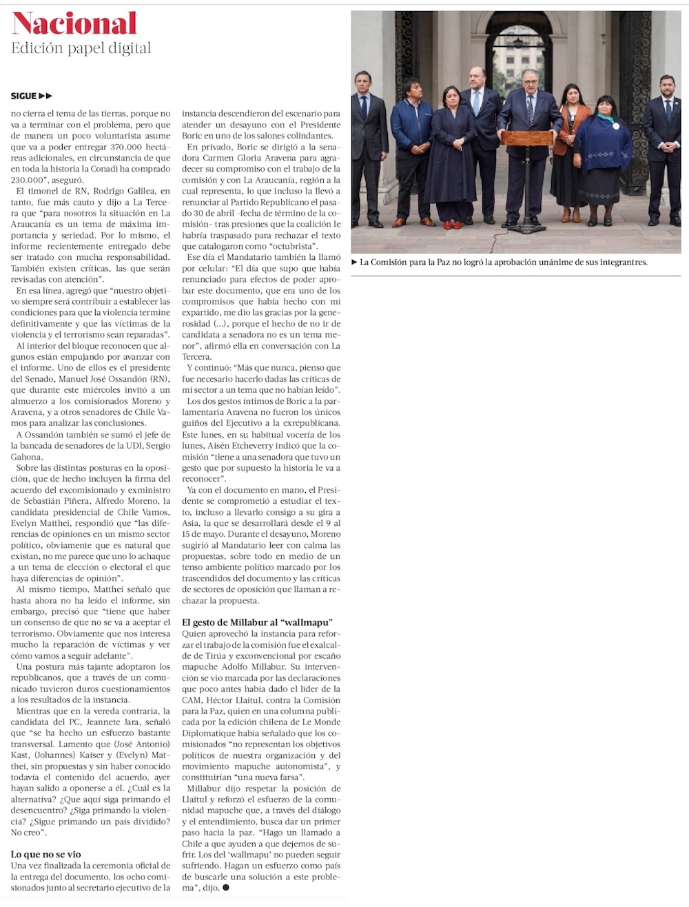 Informe de Comisión para la Paz: Concepto de “autogobierno” y fuentes de financiamiento causan dudas en la oposición - (El Mercurio de Santiago)