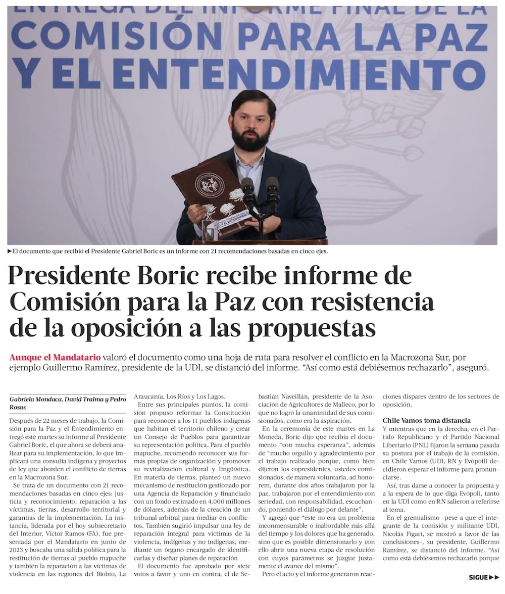 Informe de Comisión para la Paz: Concepto de “autogobierno” y fuentes de financiamiento causan dudas en la oposición - (El Mercurio de Santiago)