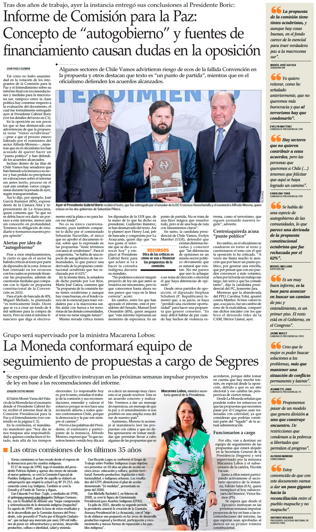 Presidente Boric recibe informe de Comisión para la Paz con resistencia de la oposición a las propuestas - (La Tercera)