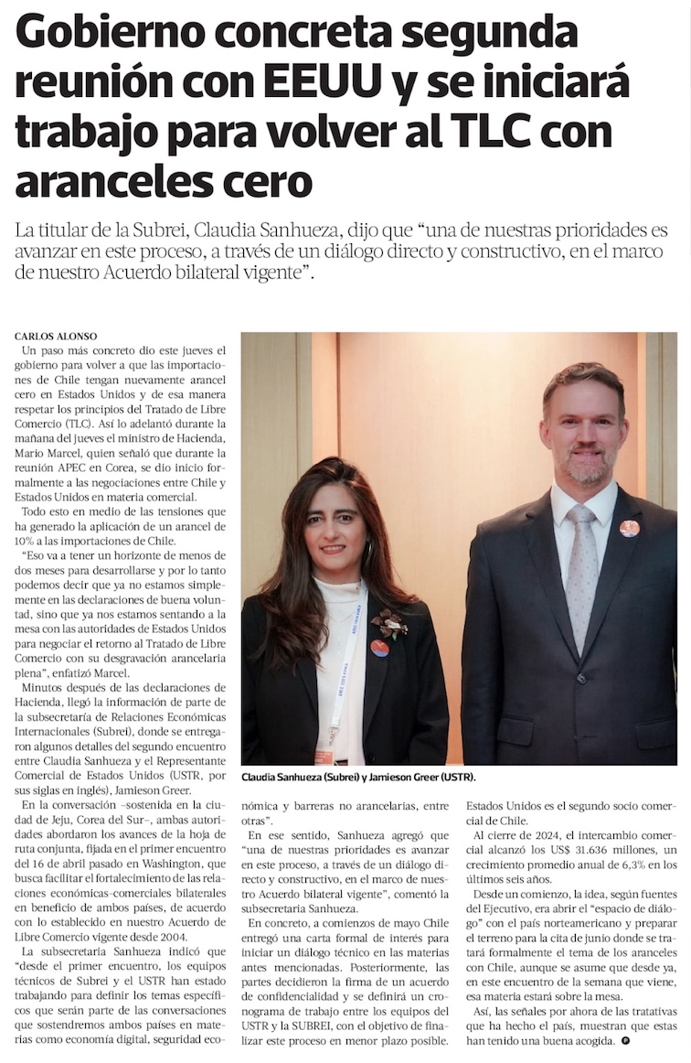 Chile se reúne con EEUU en medio de alza de arancel a 10% y acuerdo de confidencialidad - (Diario Financiero)