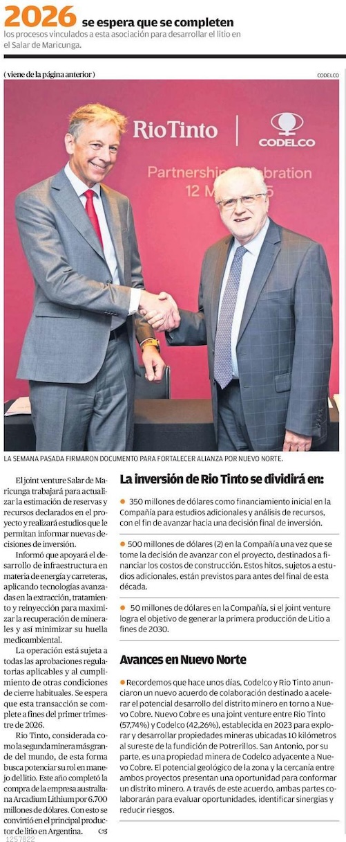 Codelco elige a Rio Tinto para explotar litio en Maricunga, pero Moody’s recorta clasificación de la estatal por mayor incertidumbre global - (Diario Financiero)