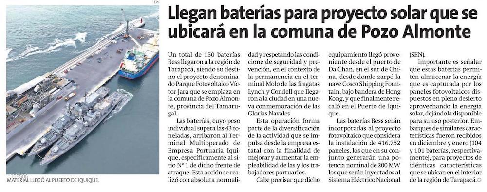 Al puerto de Iquique llega embarque de baterías para proyecto fotovoltaico - (El Longino de Iquique)