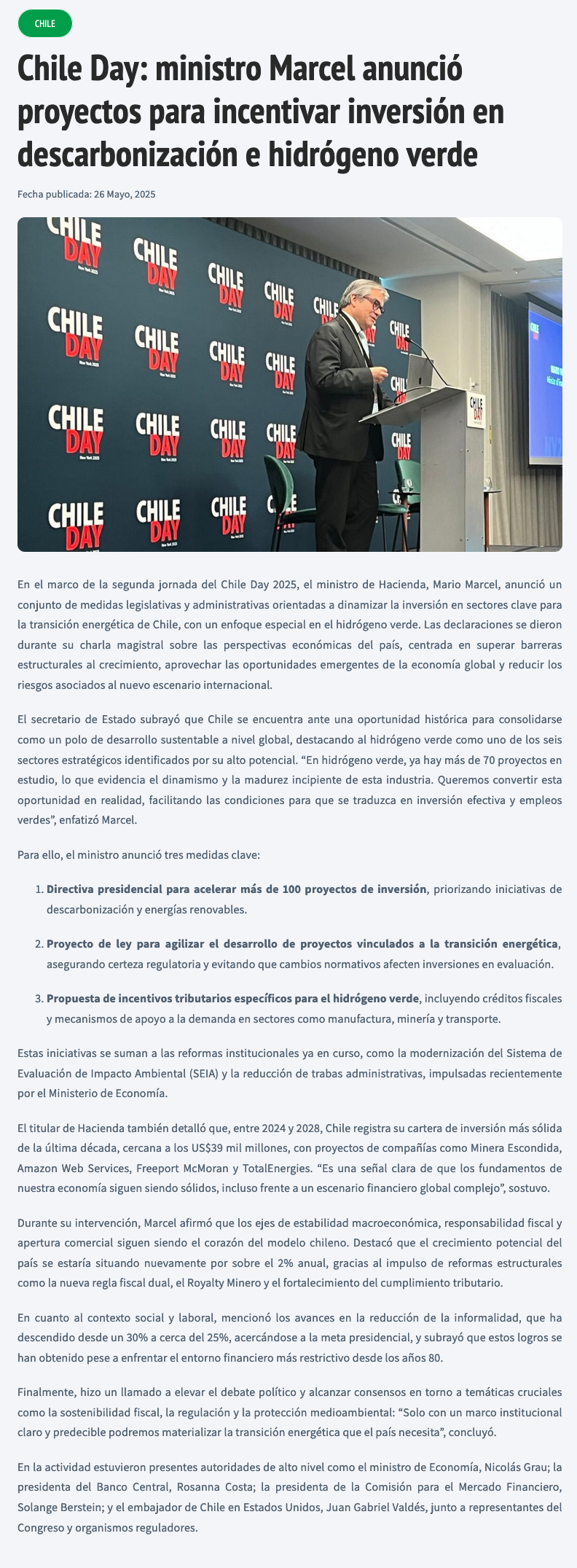 Chile Day: ministro Marcel anuncia proyectos para incentivar inversión en descarbonización e hidrógeno verde - (Estrategia)