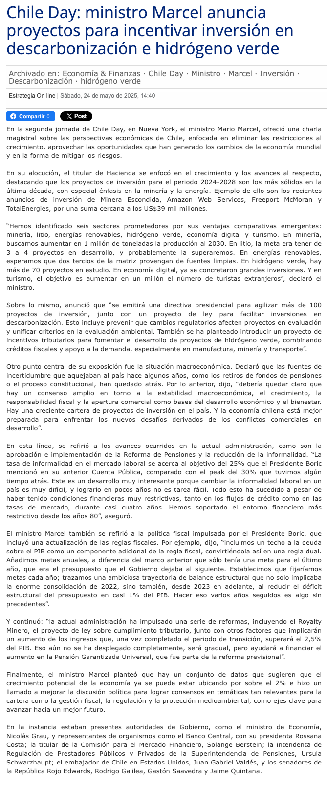 Ministro Marcel anuncia reformas clave para incentivar inversiones en hidrógeno verde y descarbonización - (cnnchile.com)