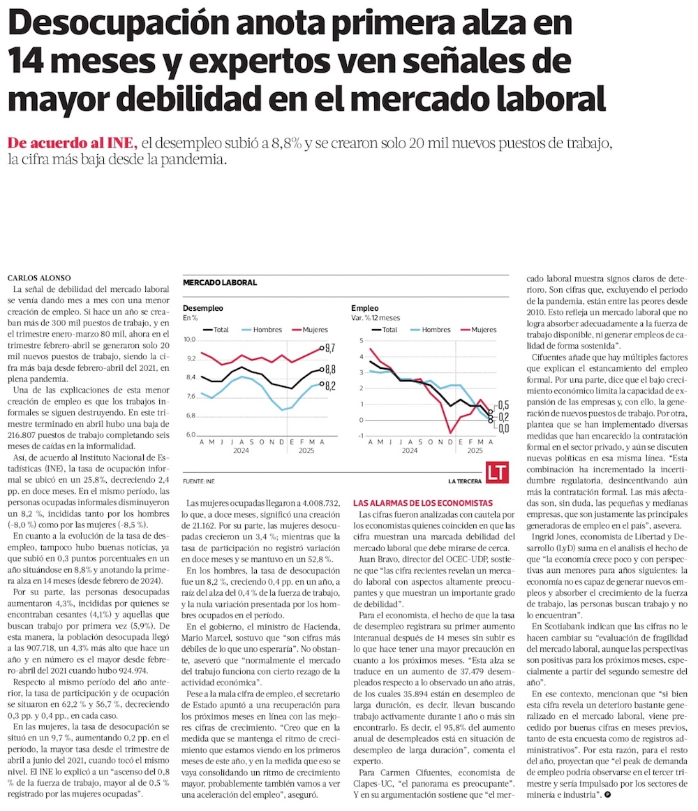 Desempleo sube a 8,8% y desaceleración en la creación de puestos de trabajo prende las alarmas - (Diario Financiero)