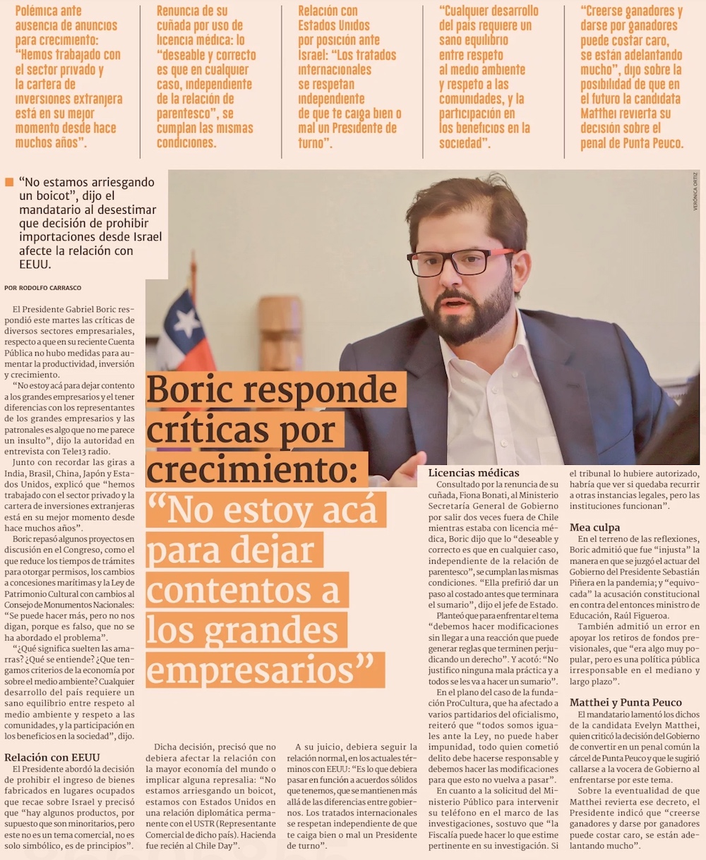 Boric responde a críticas de los gremios: “Yo no estoy acá para dejar contentos a los grandes empresarios” - (Pulso)