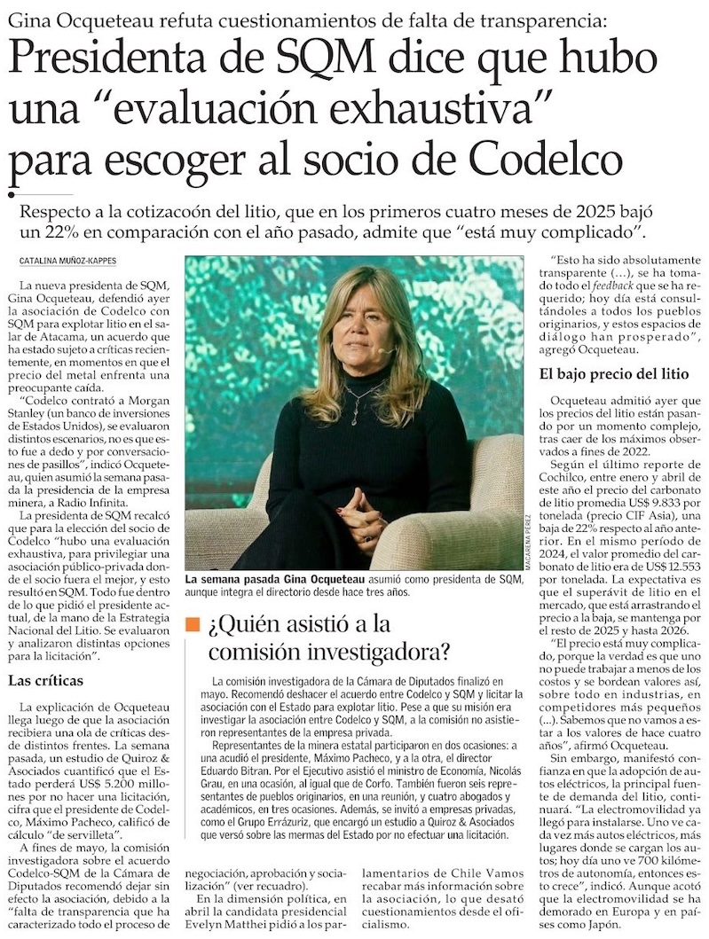 Nueva presidenta de SQM defiende acuerdo con Codelco, pero advierte que el precio del litio “está muy complicado” - (Pulso)