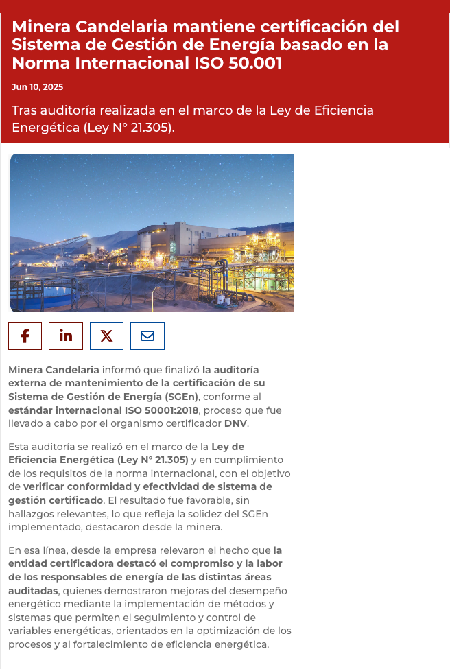 Minera Candelaria mantuvo certificación del Sistema de Gestión de Energía basado en la Norma ISO 50.001 - (electromineria.cl)