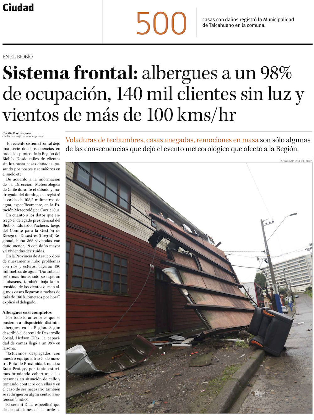 Sistema frontal deja 389 casas con daños y 3 mil damnificados en Biobío - (El Sur)