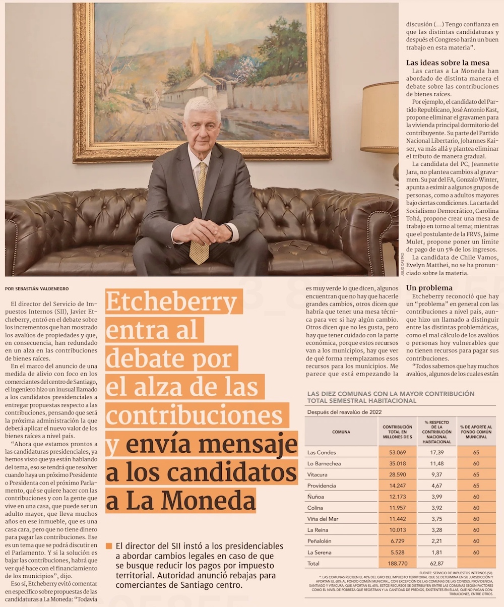 Etcheberry insiste: el 20% más rico reclama por contribuciones; los expertos lo refutan - (El Mercurio de Santiago)