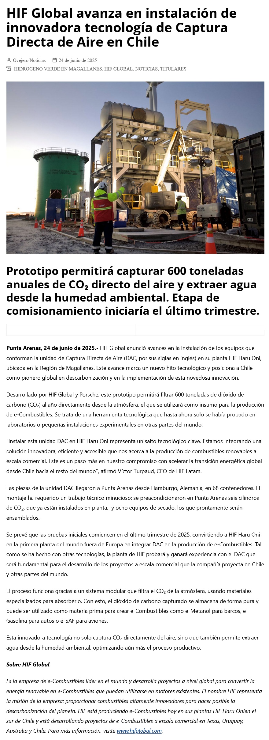 Compañía HIF Global lidera avance pionero en tecnología de captura directa de aire en Chile - (El Pingüino)