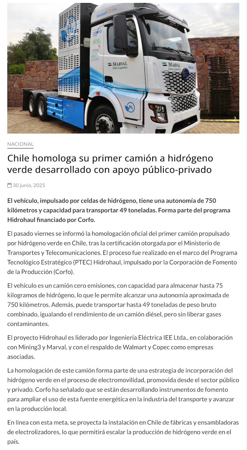 Chile homologa el primer camión a hidrógeno verde y consolida el liderazgo regional en transporte cero emisiones - (h2news.cl)