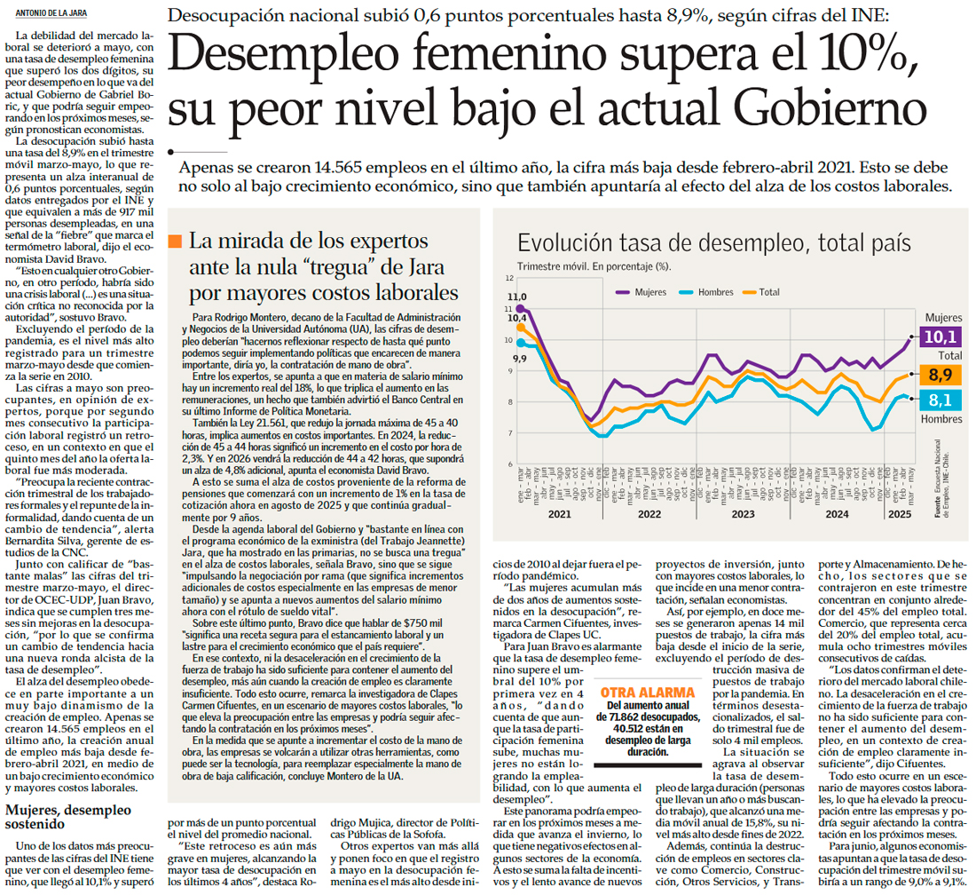 Mercado laboral se estanca y desempleo femenino llega a dos dígitos por primera vez en cuatro años - (Pulso)