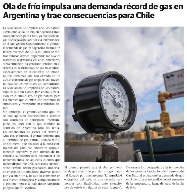 Ola de frío en Argentina genera crisis en suministro de gas y advierten impacto en envíos a Chile - (Diario Financiero)