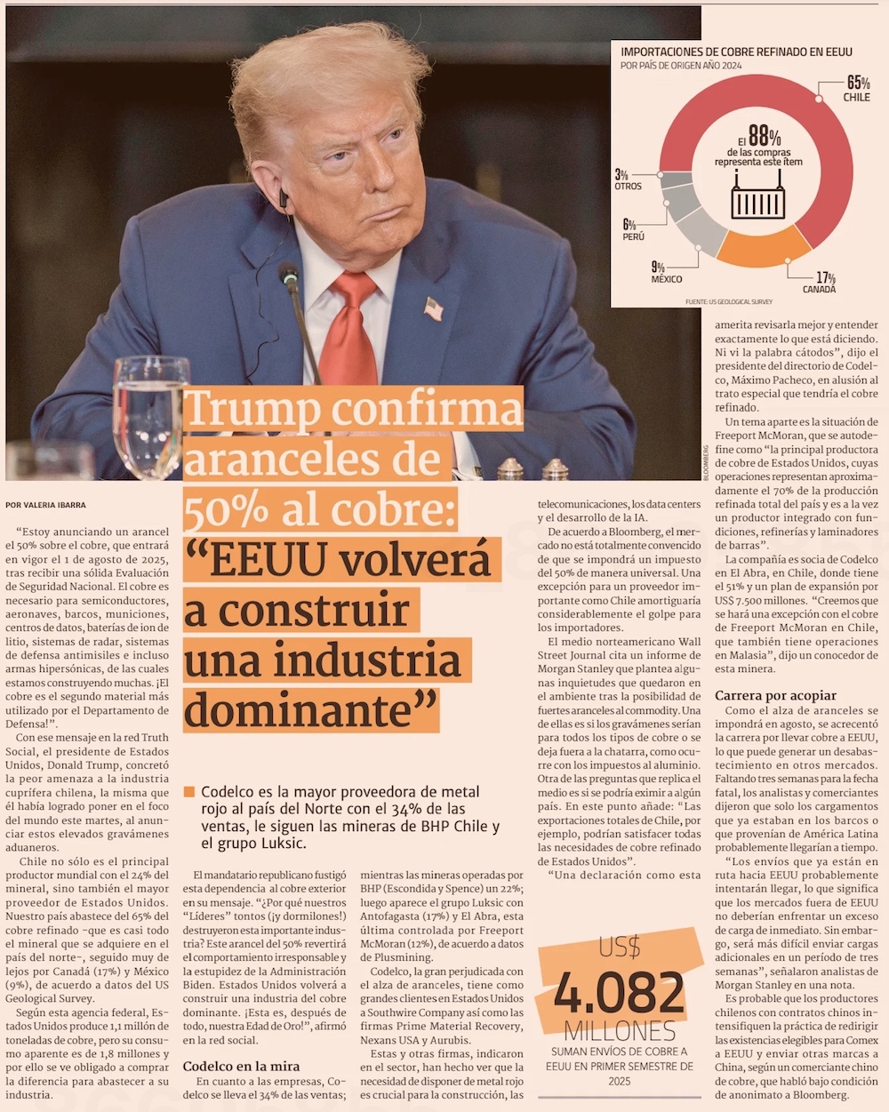 Trump confirma 50% de arancel al cobre y la medida comenzará a regir en 22 días más - (El Mercurio de Santiago)