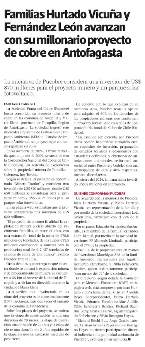 Minera de Hurtado Vicuña y Fernández León se asocia con Codelco para proyecto de US$ 900 millones - (Diario Financiero)