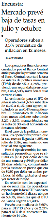 Mercado se termina de convencer y anticipa primera baja de tasas en siete meses la próxima semana - (Diario Financiero)