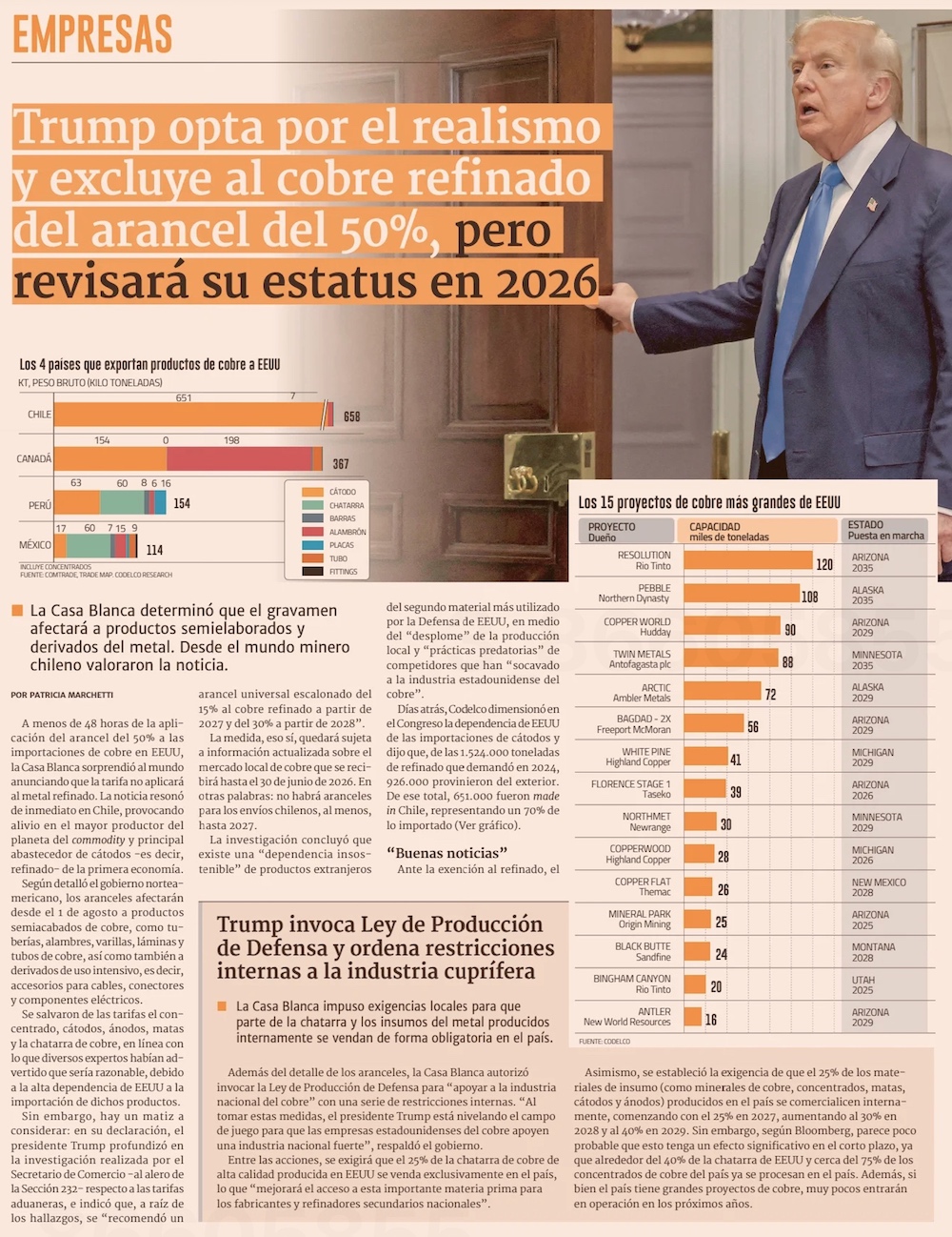 Washington excluye al cobre chileno de todo arancel al menos hasta 2027 - (El Mercurio de Santiago)