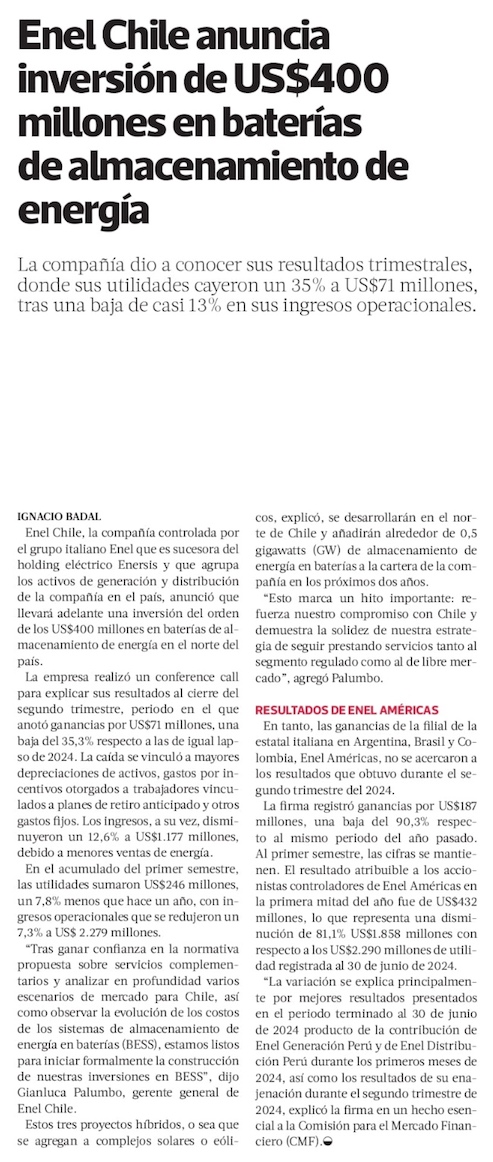 Enel apuesta en grande por almacenamiento: invertirá US$ 400 millones - (El Mercurio de Santiago)