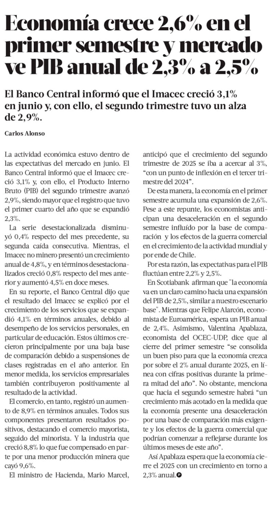 Expansión de la economía decepciona en junio y anticipa una moderación en el segundo semestre - (El Mercurio de Santiago)