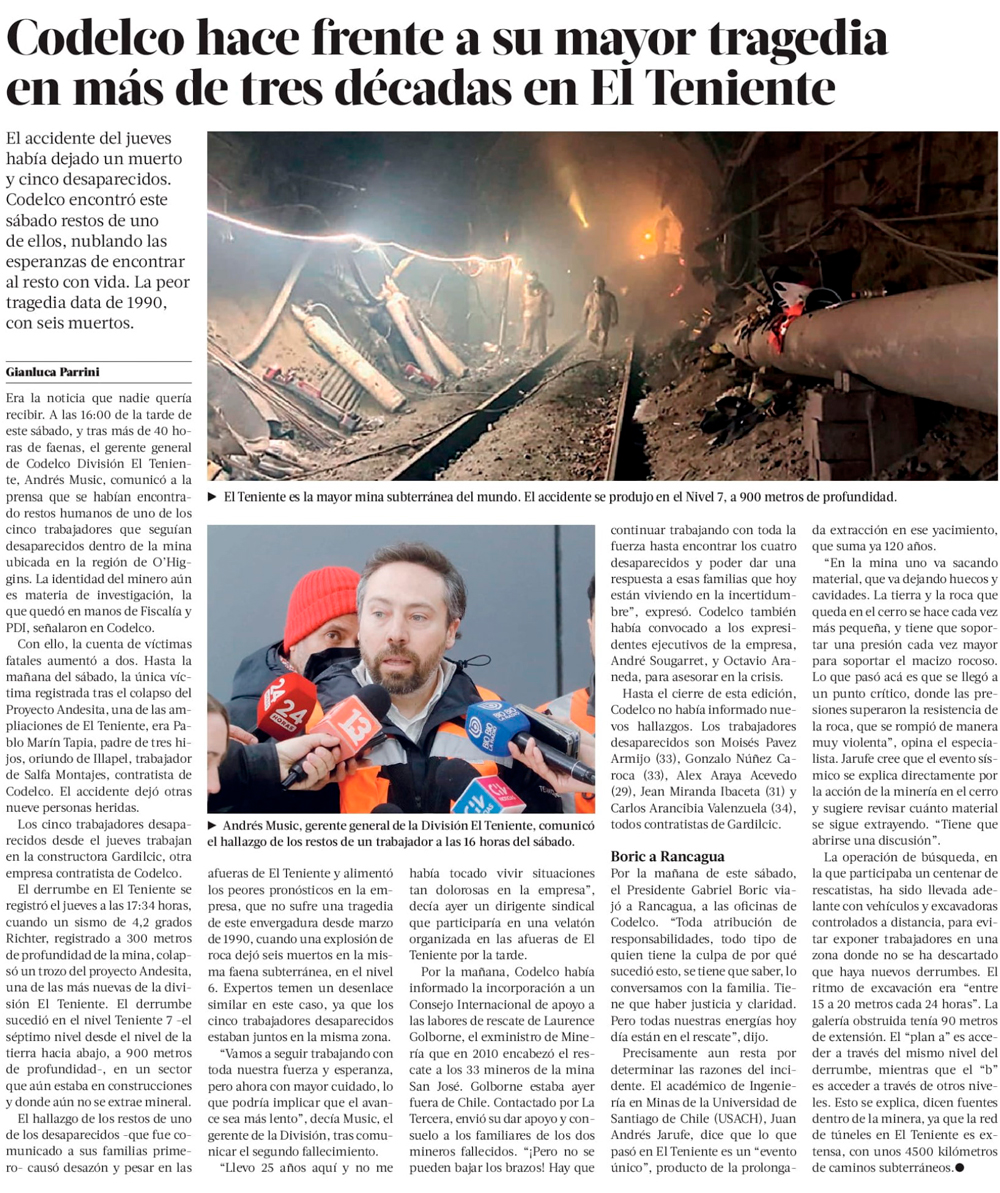 Codelco anuncia auditoría internacional para determinar “qué hicimos mal” en El Teniente - (El Mercurio de Santiago)