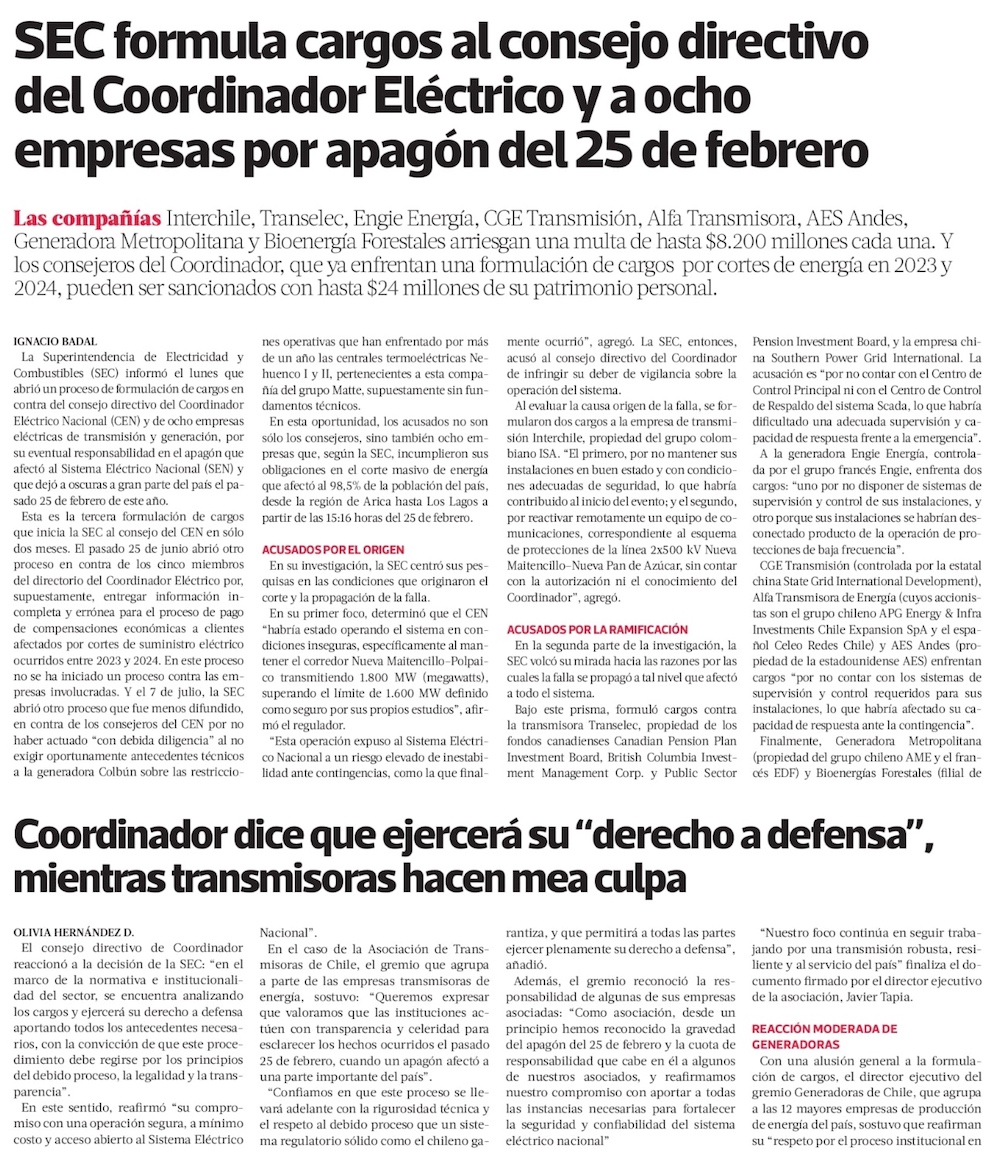 Apagón: SEC formula cargos al consejo directivo del Coordinador y a ocho eléctricas y advierte que investigación sigue - (Diario Financiero)