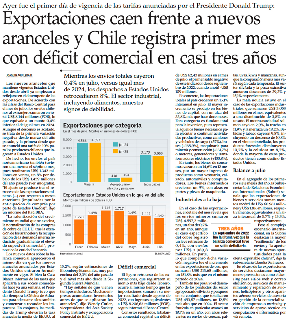 Exportaciones caen levemente en julio y se registra primer déficit comercial mensual desde septiembre 2022 - (Diario Financiero)