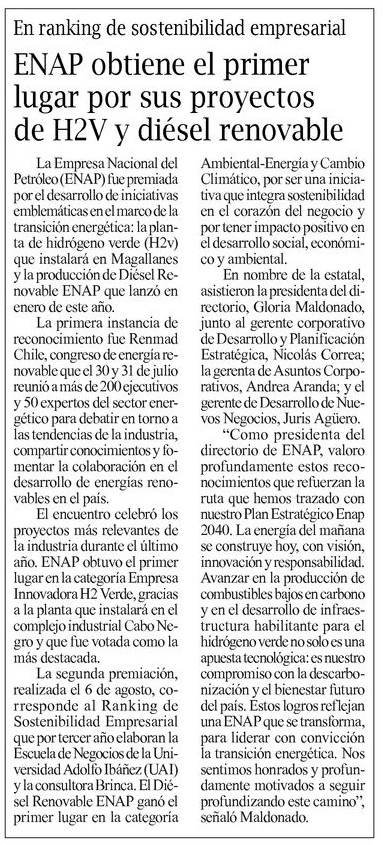 ENAP obtiene el primer lugar por sus proyectos de hidrógeno verde y diésel renovable - (radiopolar.com)