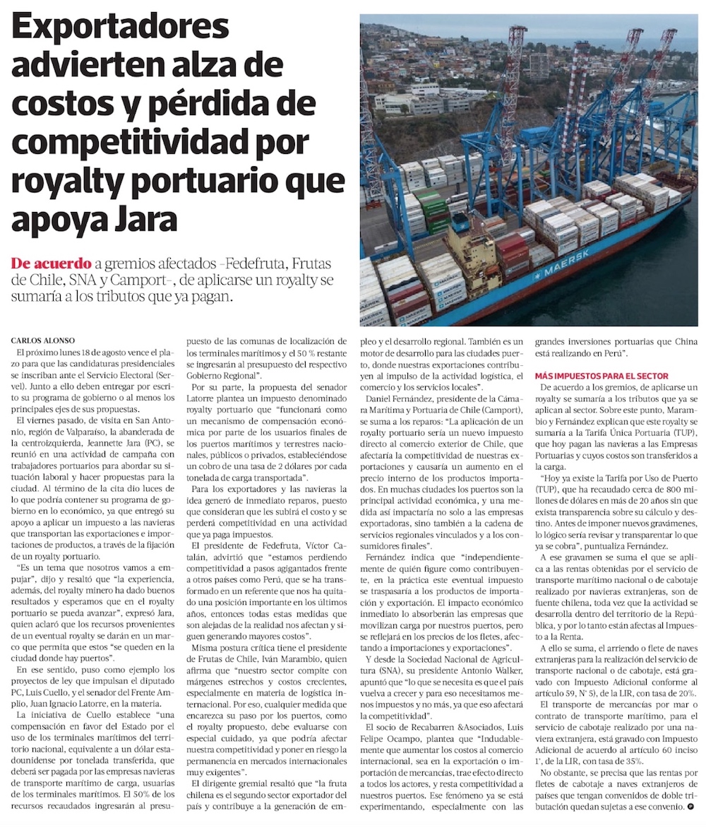 Actores del comercio exterior advierten los impactos del royalty portuario que apoya la candidata Jara - (El Mercurio de Santiago)