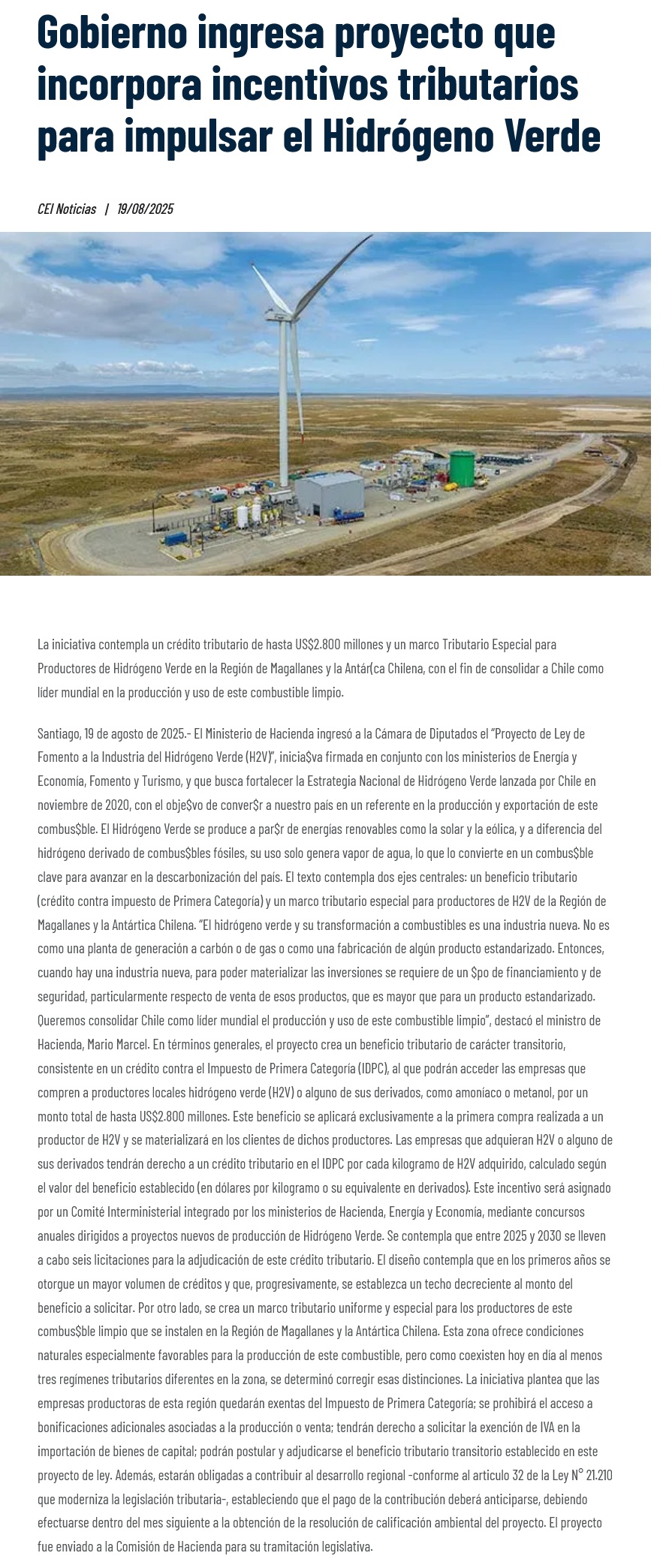 Hacienda ingresa proyecto que incorpora incentivos tributarios para impulsar la industria del hidrógeno verde - (h2news.cl)