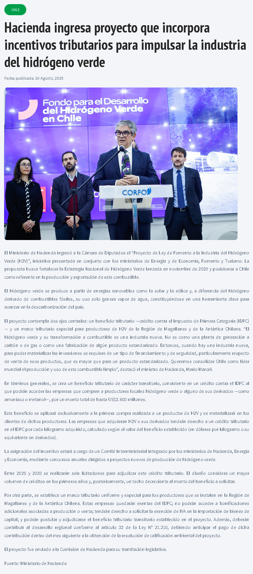 Gobierno ingresa proyecto que incorpora incentivos tributarios para impulsar el Hidrógeno Verde - (ceinoticias.cl)