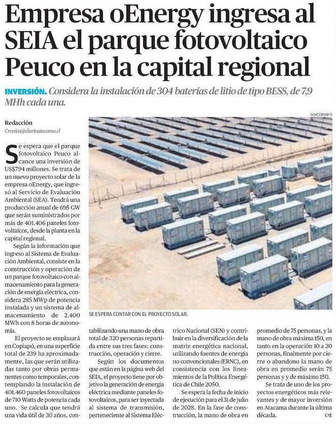 Empresa oEnergy ingresa al SEIA parque fotovoltaico por US$ 794 millones en la Región de Atacama - (Diario Financiero)