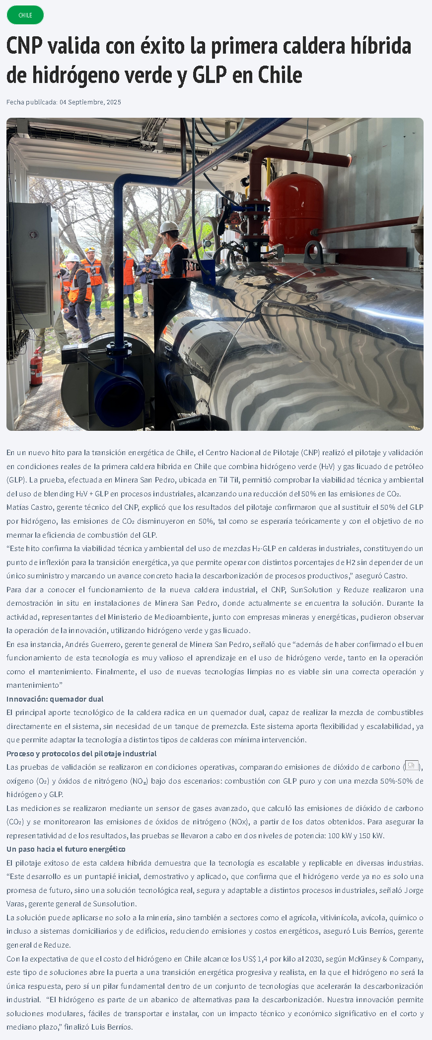CNP valida con éxito la primera caldera híbrida de hidrógeno verde y GLP en Chile - (mineriayfuturo.cl)