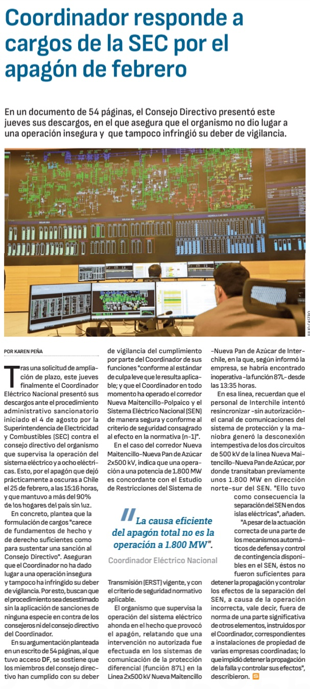 Coordinador se defiende por mega apagón - (El Mercurio de Santiago)