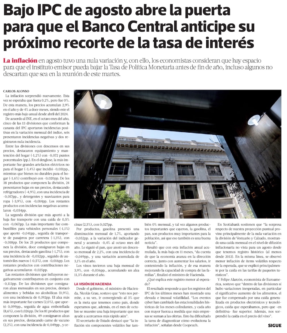 Agosto da un alivio inflacionario y el Banco Central prepara el camino para futuros recortes de tasa - (El Mercurio de Santiago)