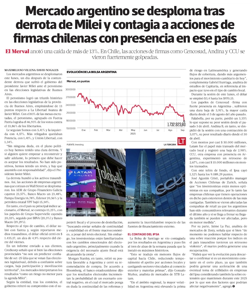 Acciones chilenas expuestas a Argentina caen fuerte luego de derrota de Milei en Buenos Aires - (El Mercurio de Santiago)