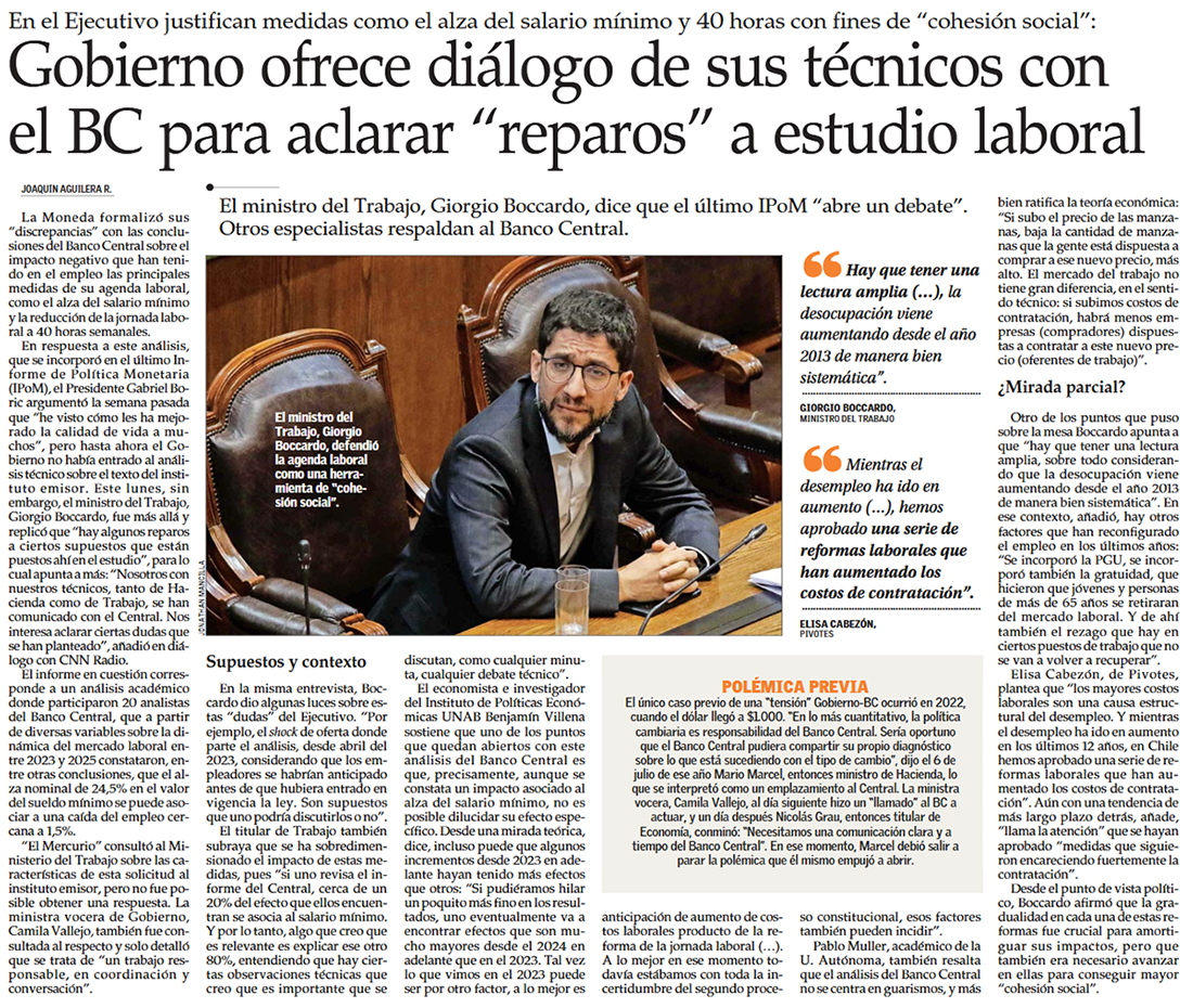 Gobierno activa conversaciones con el Banco Central tras polémico análisis laboral en el IPoM - (Diario Financiero)