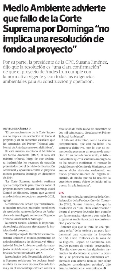 Gobierno insistirá en impugnar el proyecto Dominga, independiente de la resolución de la Corte Suprema - (El Mercurio de Santiago)