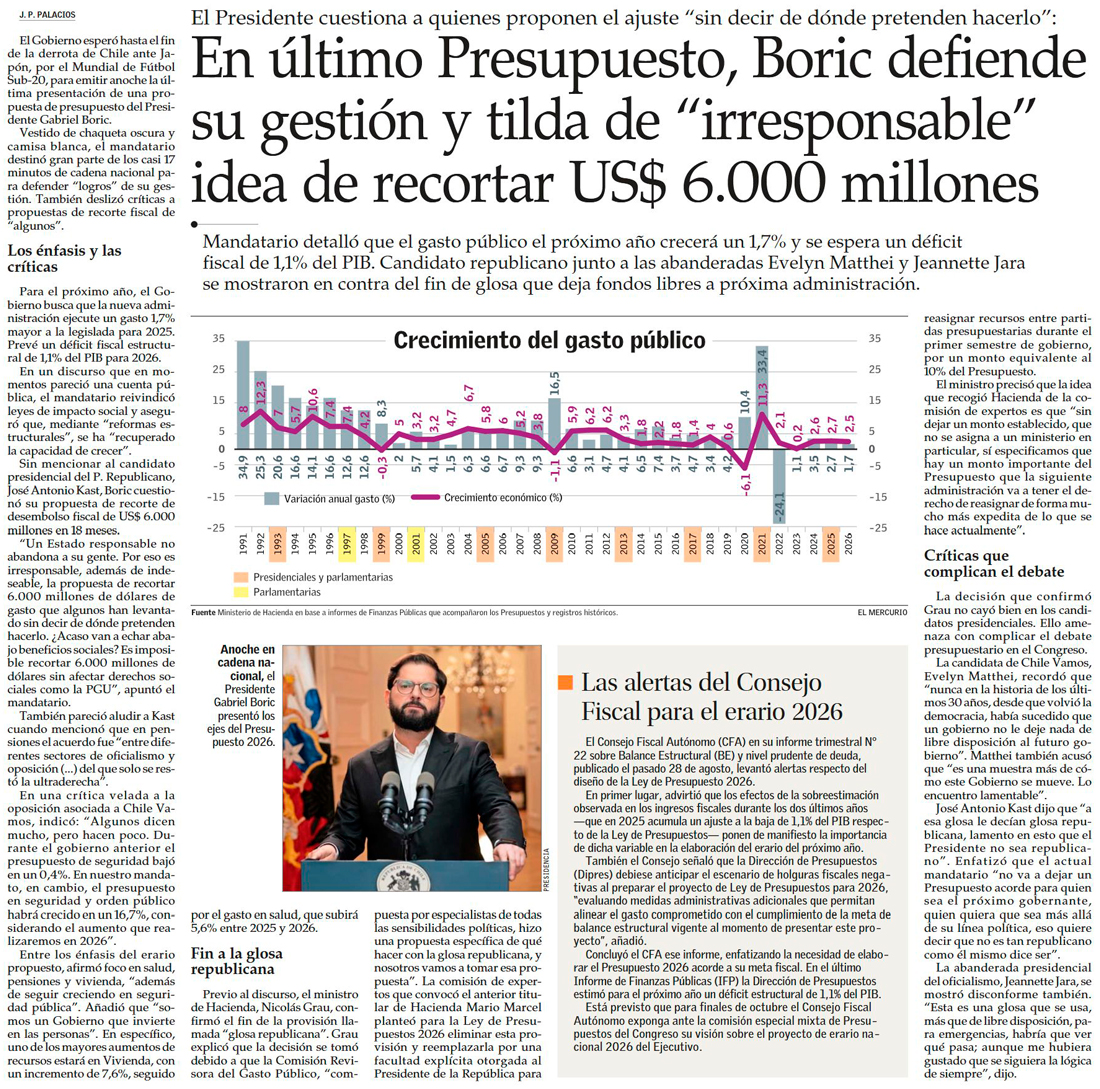 Boric propone Presupuesto 2026 con un alza del gasto de 1,7% y utiliza discurso oficial para criticar plan fiscal de Kast - (Diario Financiero)