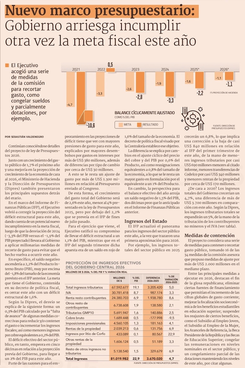 Gobierno admite mayor incumplimiento de meta fiscal este año, y oposición y expertos ponen en entredicho cifras del Presupuesto 2026 - (Pulso)