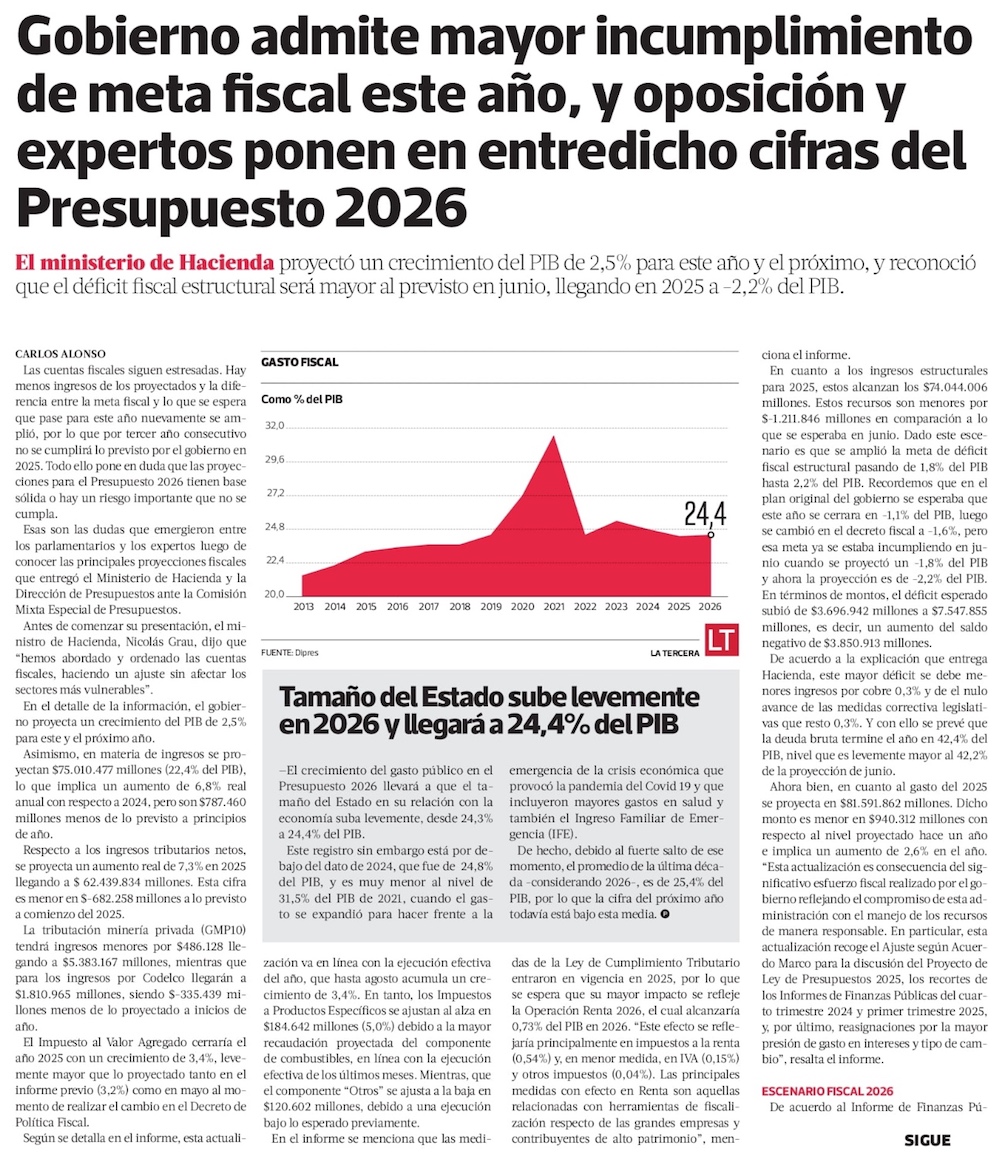 Gobierno incumplirá por tercer año seguido la regla fiscal y siembra dudas para Presupuesto - (El Mercurio de Santiago)