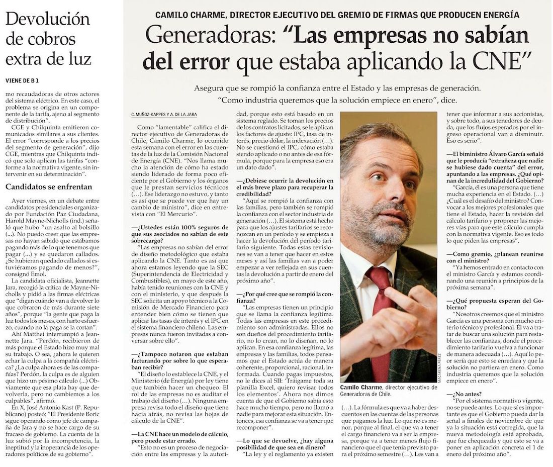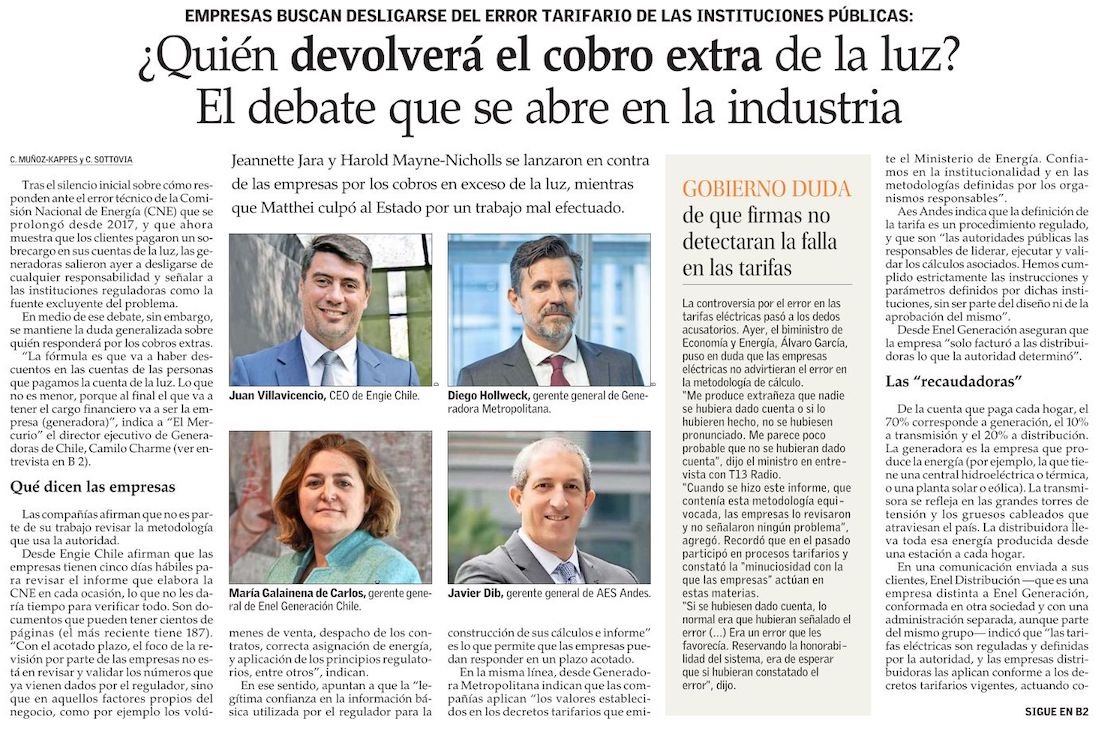 Error de calculo en cuentas de la luz: $32 mil millones en sobreprecio por atraso en decretos tarifarios y eléctricas evalúan acciones legales contra el Estado - (El Mercurio de Santiago)