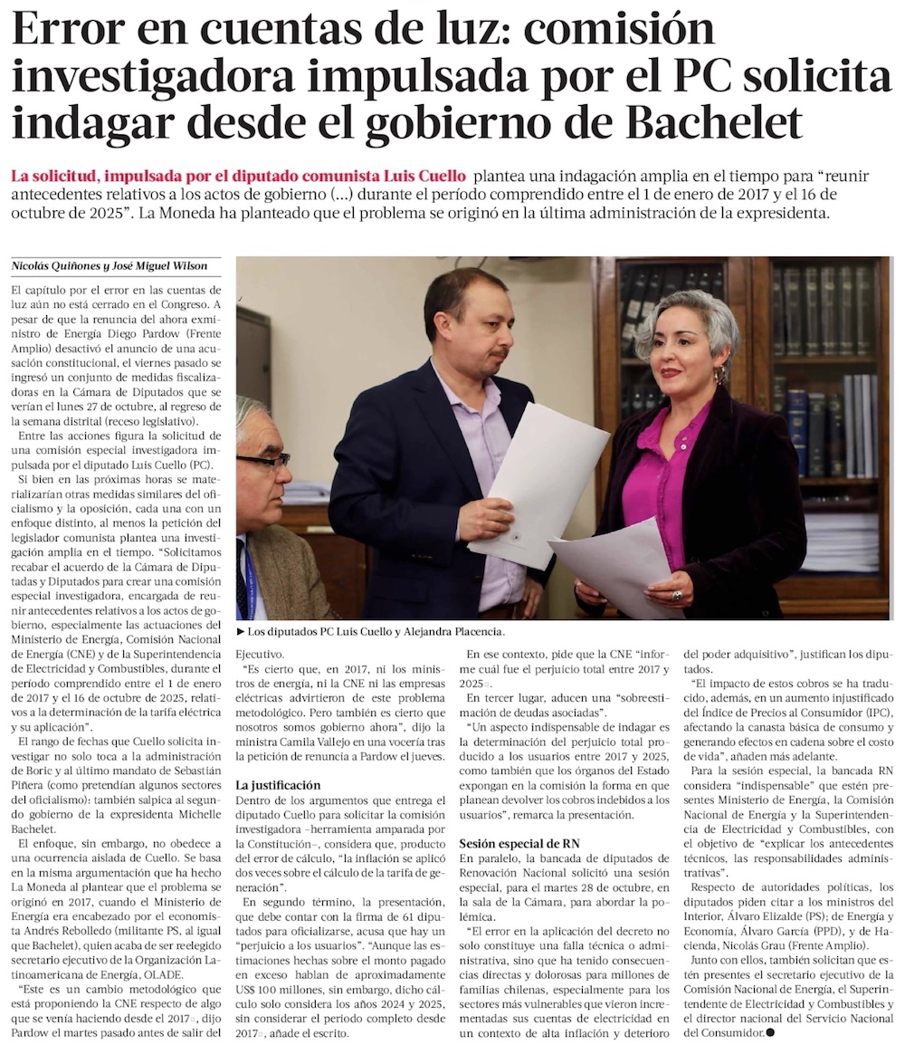 Error de calculo en cuentas de la luz: $32 mil millones en sobreprecio por atraso en decretos tarifarios y eléctricas evalúan acciones legales contra el Estado - (El Mercurio de Santiago)